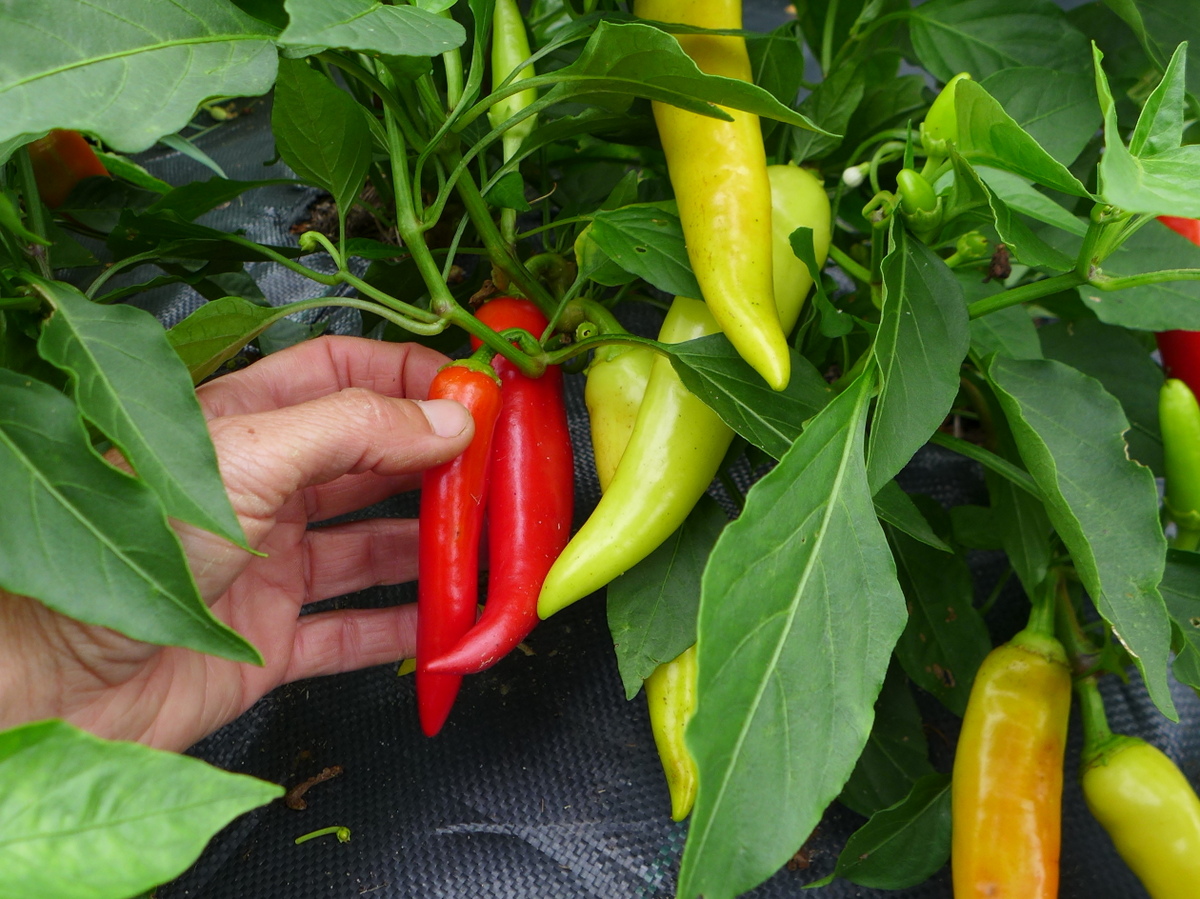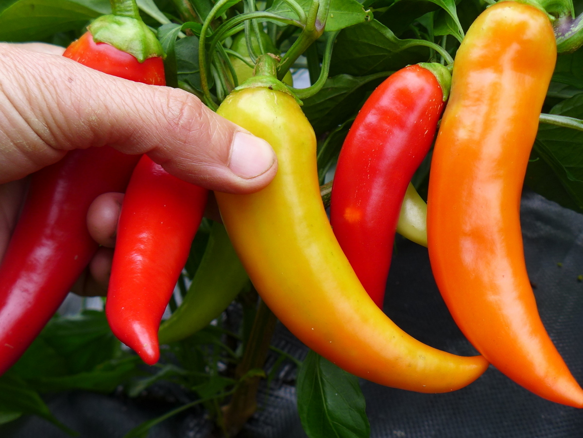 Hot pepper. Yellow becoming orange and then red. 12 to 15 cm long. Medium-thick flesh and thin skin. Ideal for making pickled hot peppers. Heat rating of 6 on the Scoville scale. Very productive plant. 60 cm tall plant. Need support. Similar to Hungarian Hot Wax pepper. 60 days to maturity.