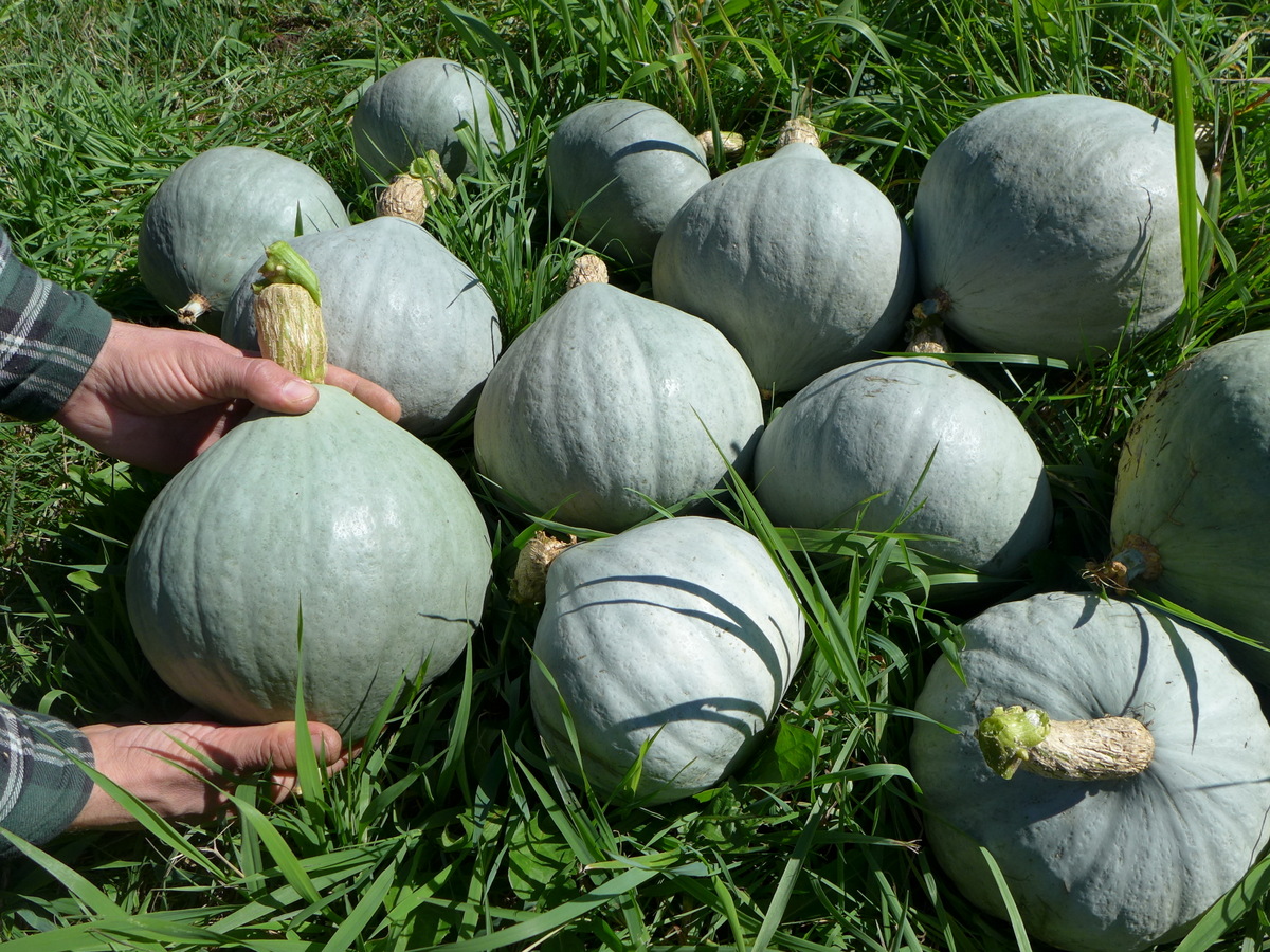 Blue-gray, spinning top-shaped winter squash, 15 to 25 cm in diameter. Dark orange flesh, non-fibrous, excellent flavor. Productive and early. Creeping plant of 2 to 3 meters in length. 95 days to maturity.