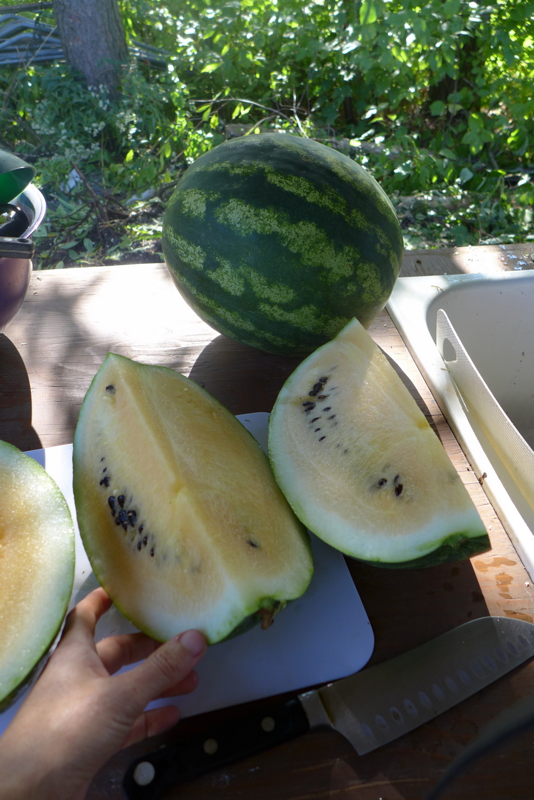 In 2019, the first time we tried to grow Petite Yellow watermelon, we harvested this melon. Just looking at it, it’s clear that it’s not Petite Yellow: it’s not Petite, and it’s not Yellow! We informed the supplier so that he could tell us which variety it might be, but he wasn’t very cooperative. Normally, we wouldn’t have tried so hard to identify it. But damn, without being very sweet, all the melons we had, we couldn’t stop eating them.