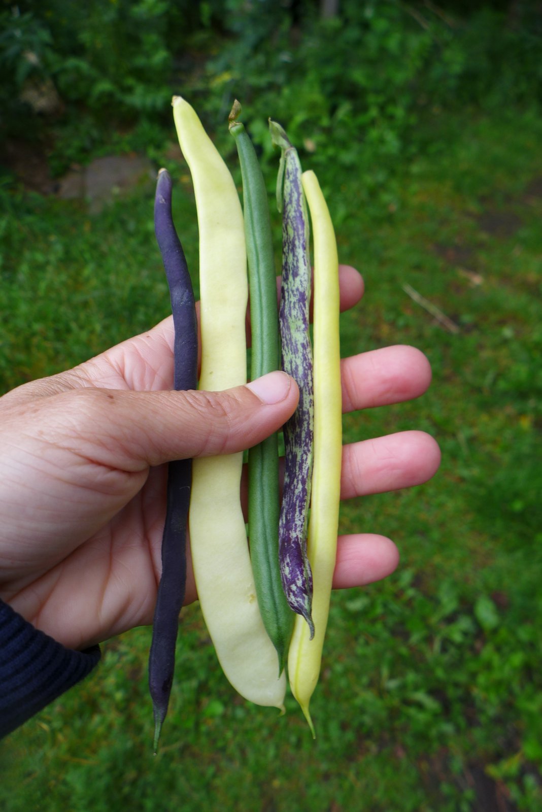 Snap pole beans. Need a 2 meter stake. Lazy Housewife (green), Carminat (mauve), Selma Zèbre (green zebra mauve), Monte Gusto and Merveille de Venise (yellow).