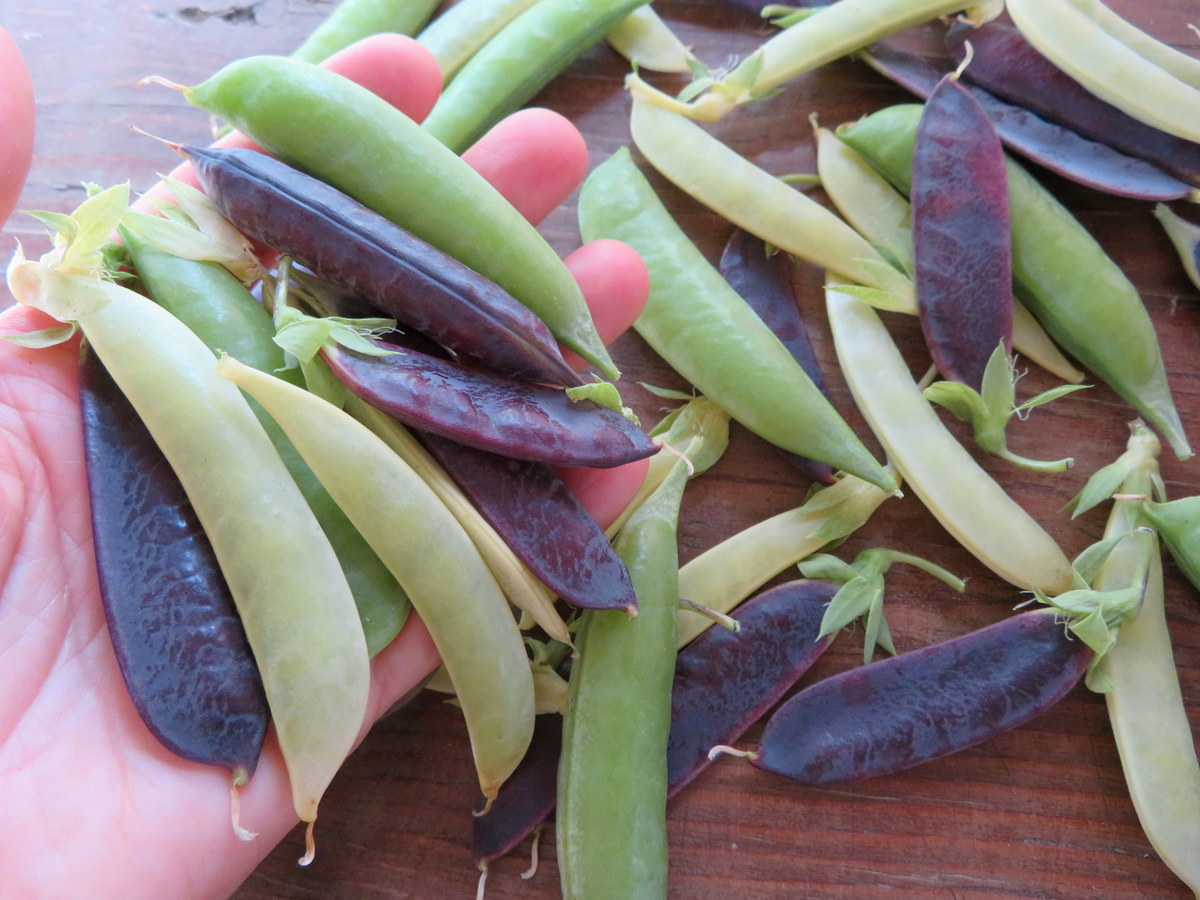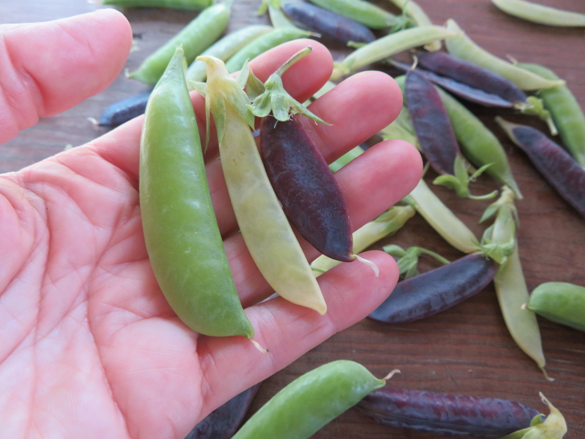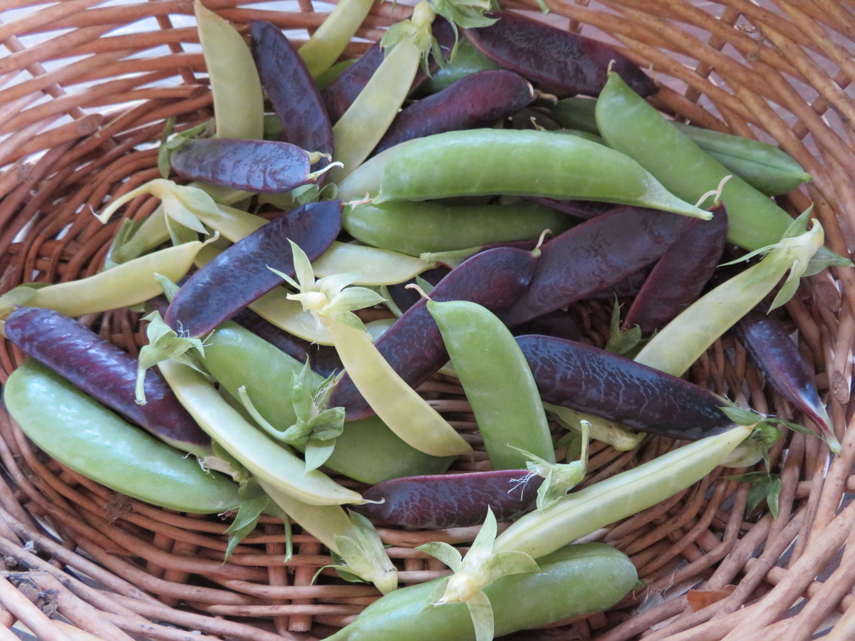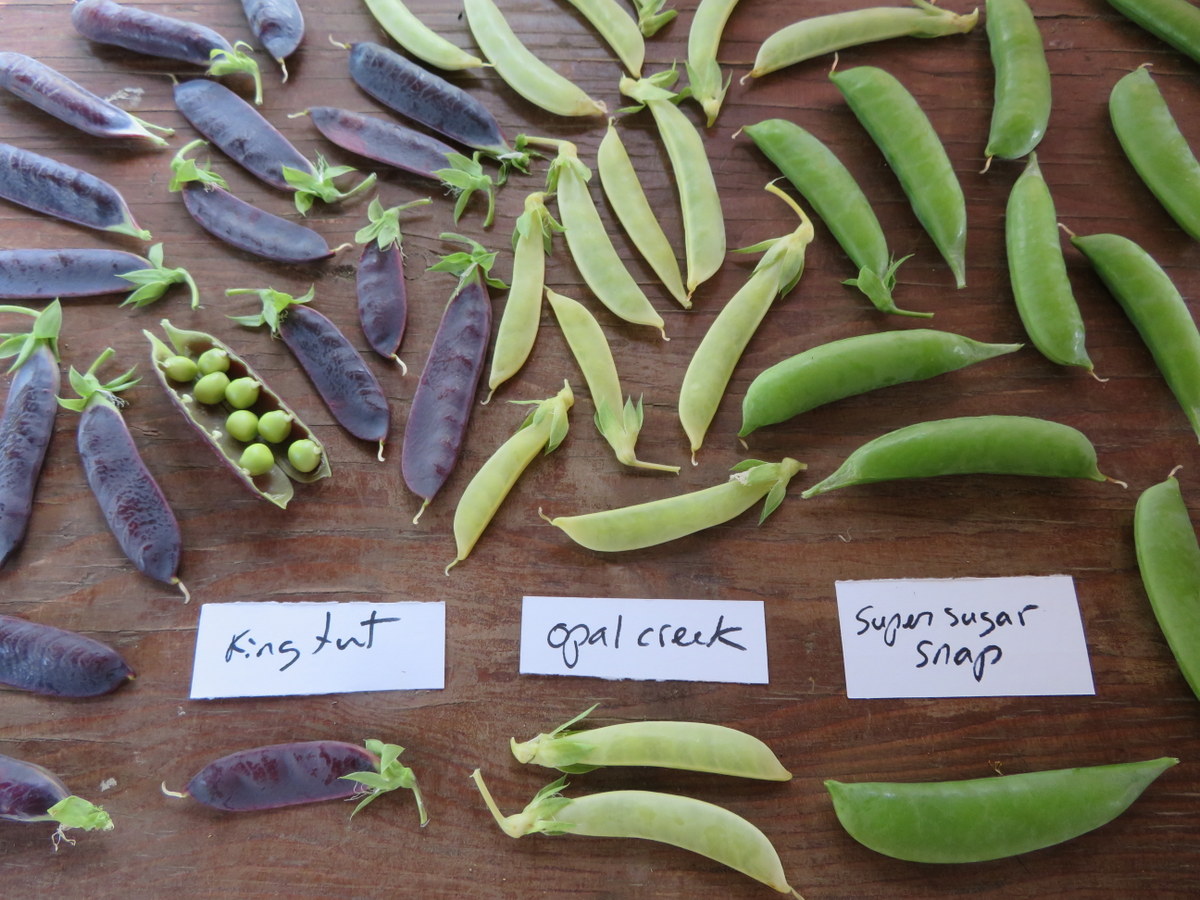 3 pea varieties. Opal Creek (yellow), Super Sugar Snap (green) and King Tut (purple). Climbing plants, 2-meter supports required.