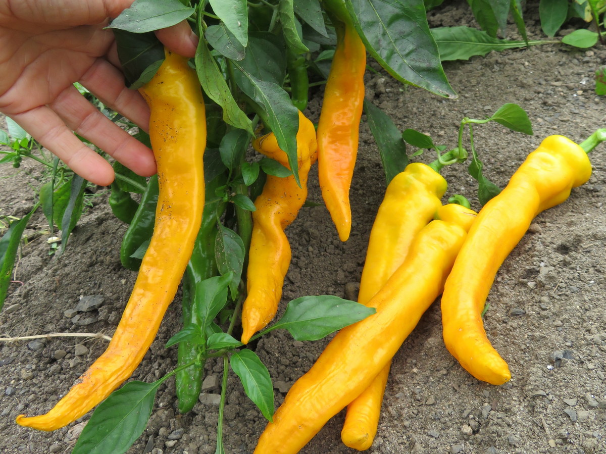 Thin-fleshed sweet pepper with an elongated shape, 10 to 25 cm long. Green becoming golden yellow at maturity. Very good sweet flavour. To eat raw or cooked. Very well adapted to freezing. Makes an excellent paprika. Productive and early plant of 60 cm height. Heirloom variety originating from the South-East of France. 60 days to maturity.