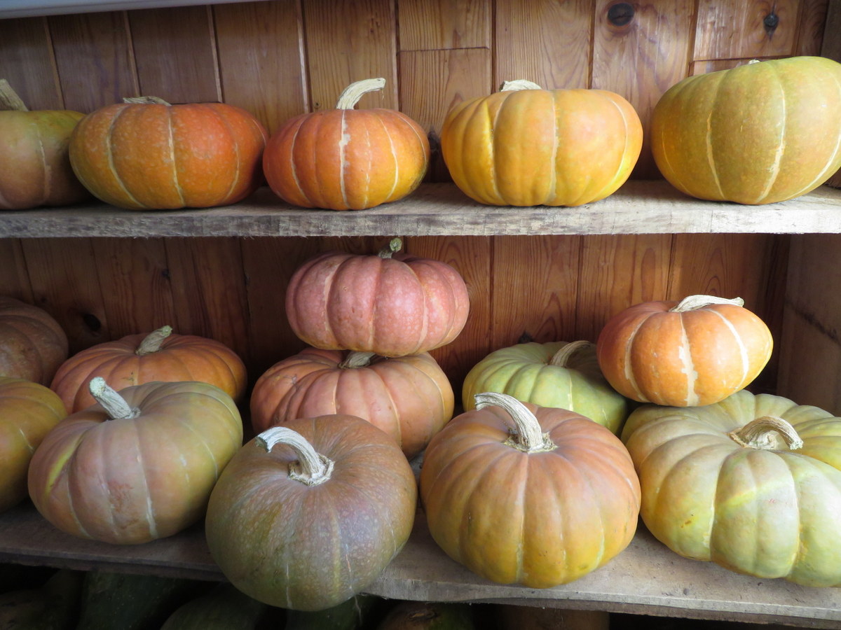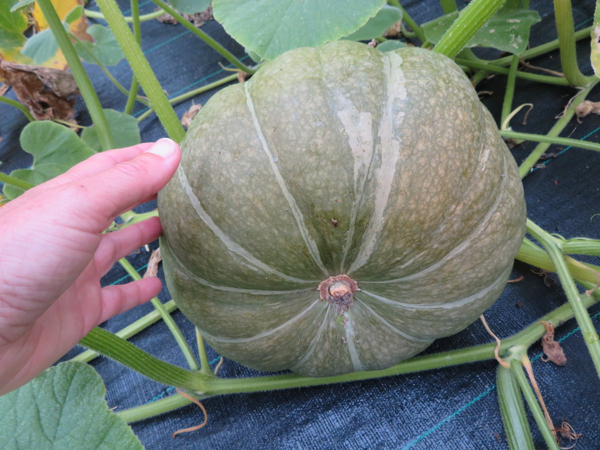Winter squash, round, flattened, sometimes ribbed, green-gray in color, turning pinkish brown and finally orange. 25 to 45 cm in diameter. Flesh not fibrous, good taste. Productive and early. Creeping plant of 2 to 3 meters in length. 90 days to maturity.
