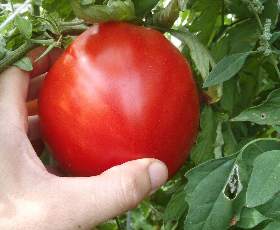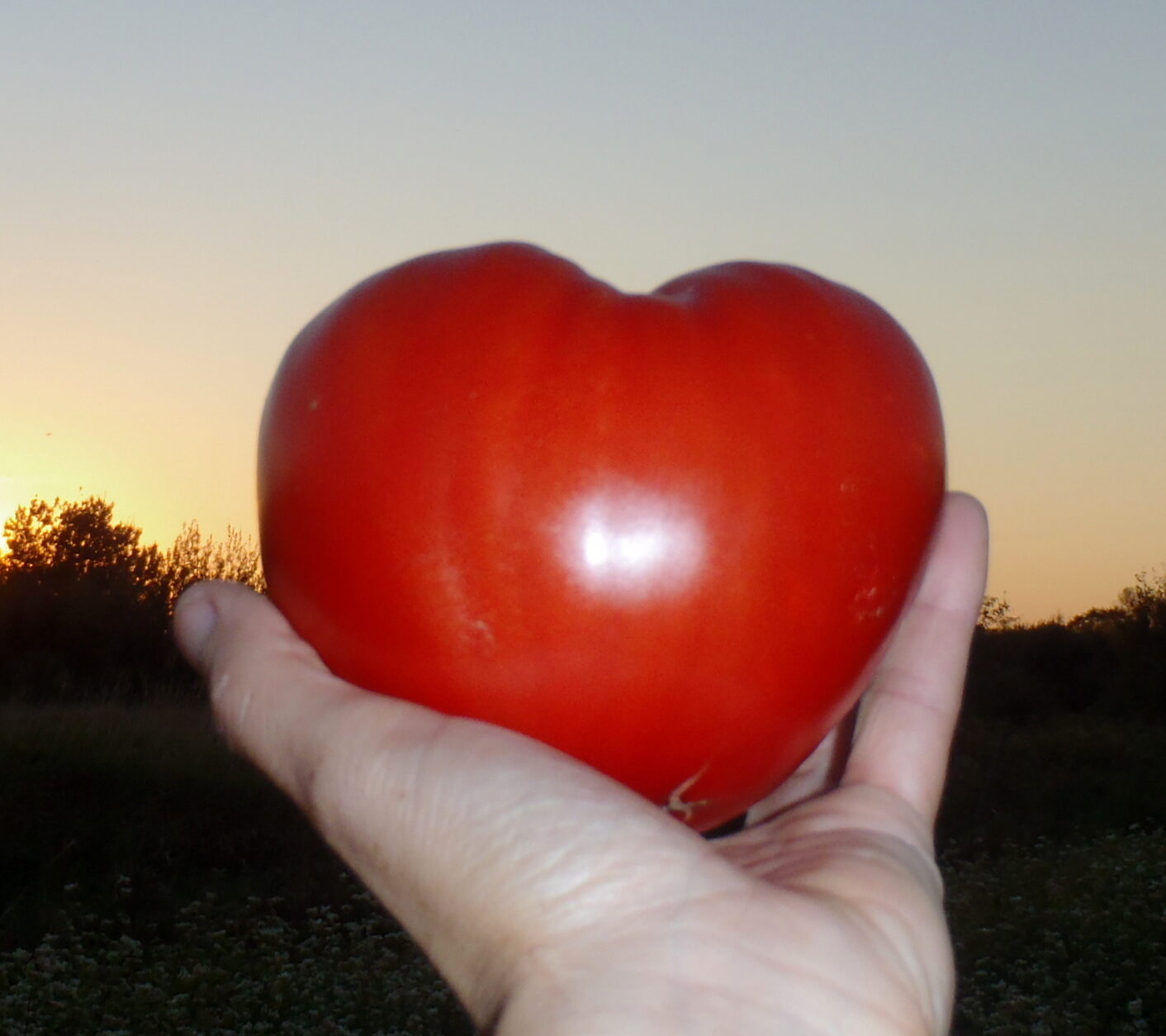 Large red oxheart tomato with exceptional flavor. The tomato that haunts our winter dreams. Very fleshy, 8 to 15 cm in diameter. Few seeds. Productive, vigorous 2-meter plants. Good resistance to cold at the end of the season. Originally from Russia. Indeterminate. 75 days to maturity.