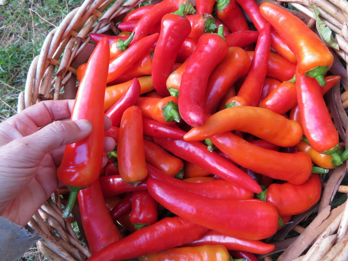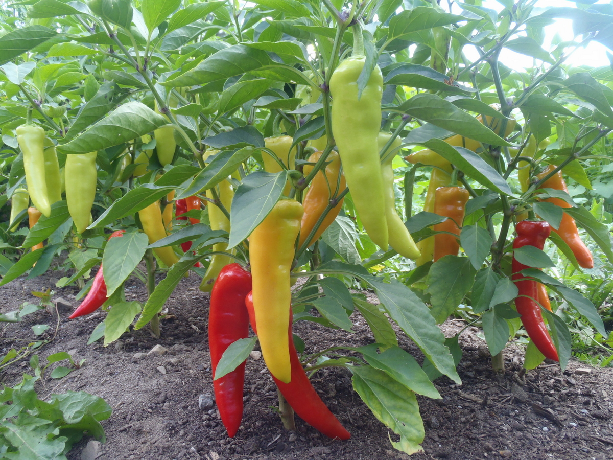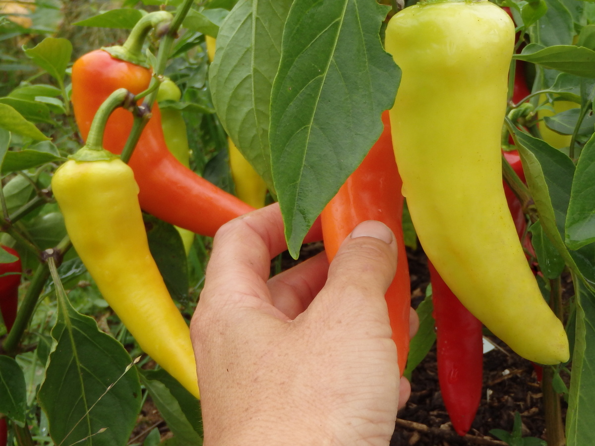 Thin-fleshed sweet pepper 15 to 20 cm long, yellow turning orange and then red. Can be eaten at any stage. Very good raw or cooked. Ideal for making pickled peppers. Plant height 50 cm, very productive. 65 days to maturity.