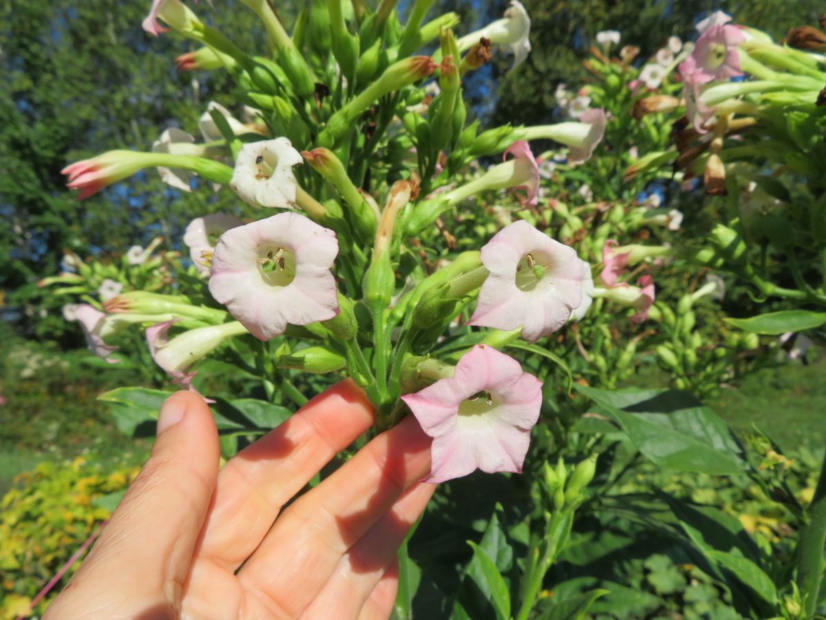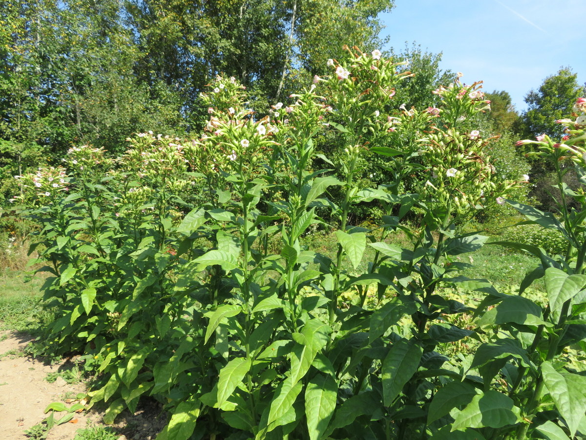 I like tobacco plants for their ornamental aspect. This one has a particular look, narrower than the others, with large clumps of flowers. We grew them unsupported in a fairly windy field. The plants eventually collapsed to the ground, and each of the branches sprang up to form new plants – it was quite beautiful!