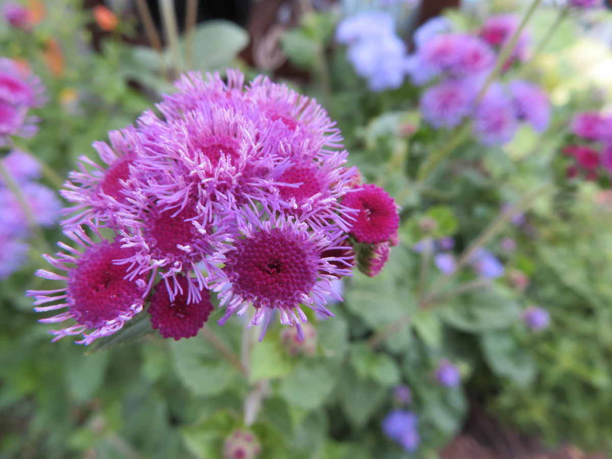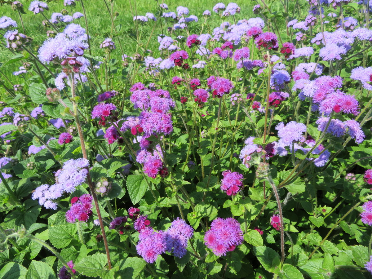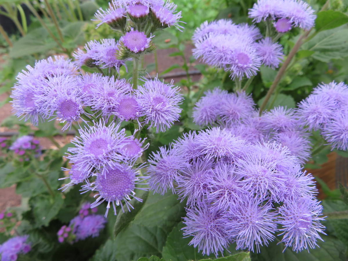 Annuelle. Fleurs de couleur bleu-mauve, parfois rouge pourpre ou blanches. Plant buissonnant de 30 à 60 cm de hauteur. N’a pas besoin de support. Longue floraison de juillet jusqu’au gel. Fait de belles fleurs coupées. Aussi appelée Agérate du Mexique.