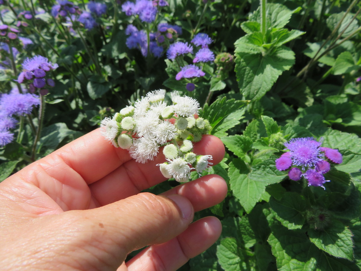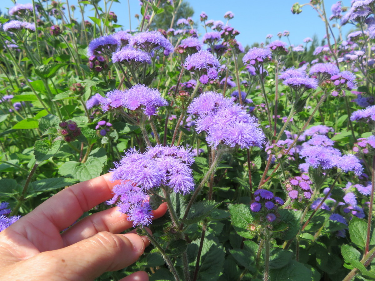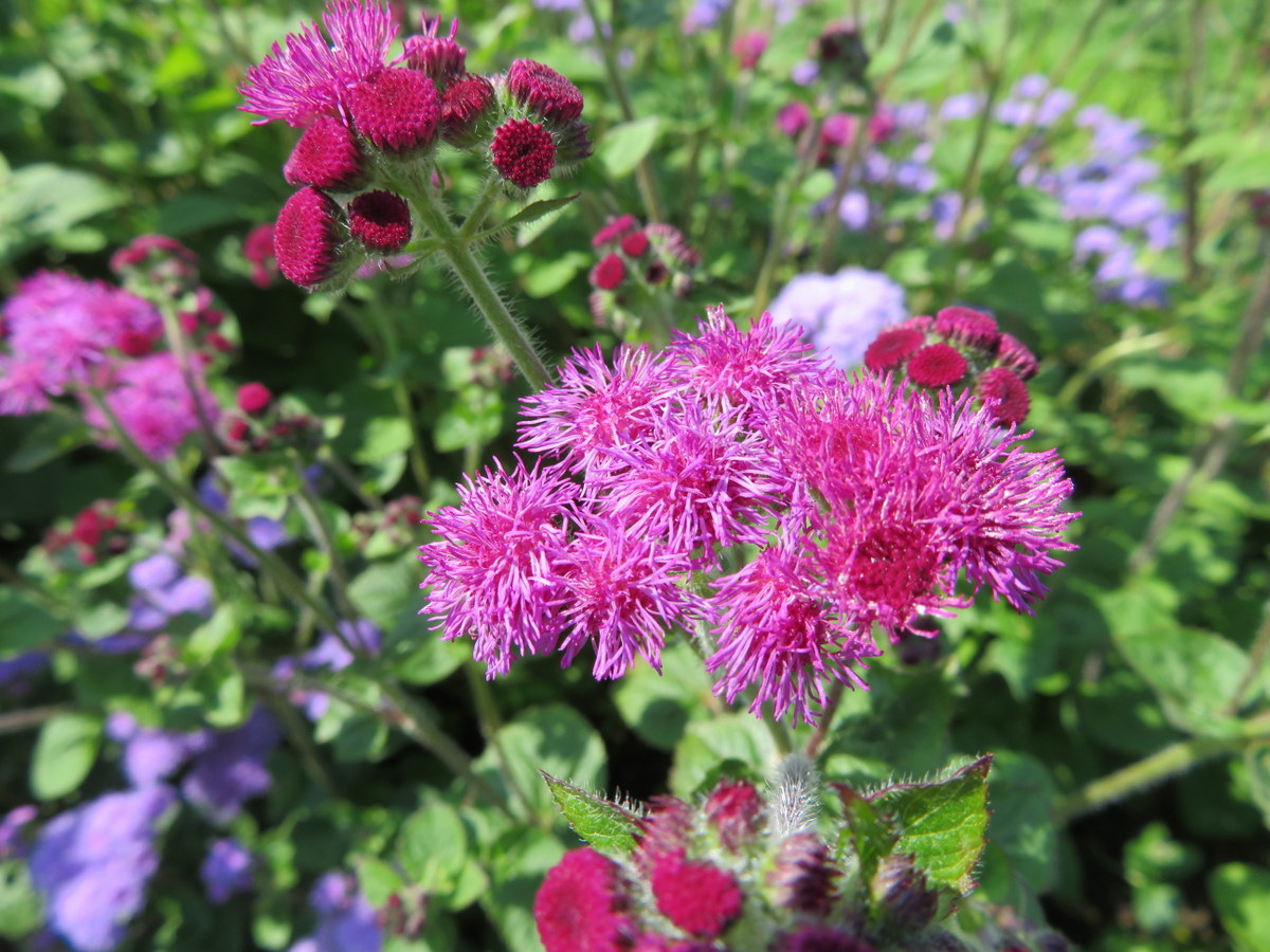Annuelle. Fleurs de couleur bleu-mauve, parfois rouge pourpre ou blanches. Plant buissonnant de 30 à 60 cm de hauteur. N’a pas besoin de support. Longue floraison de juillet jusqu’au gel. Fait de belles fleurs coupées. Aussi appelée Agérate du Mexique.