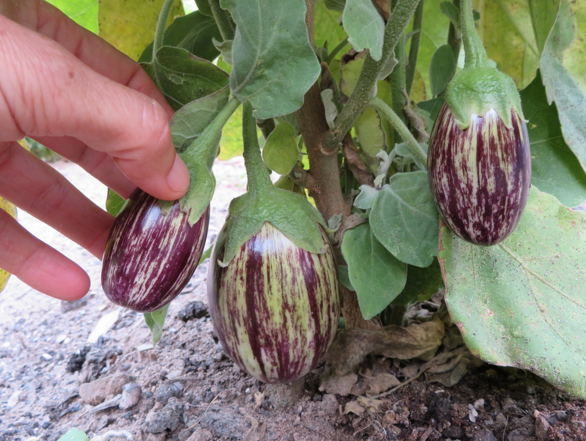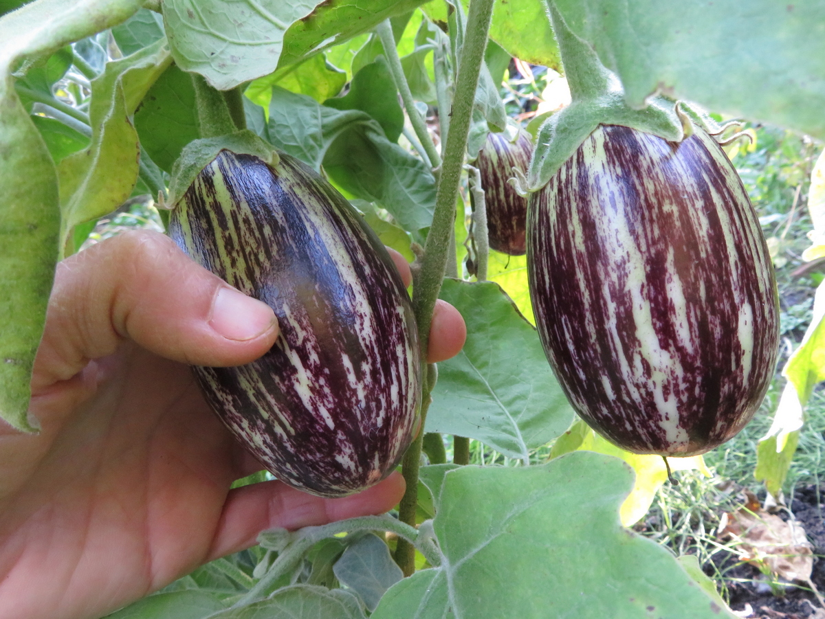 Aubergine rayée violette et blanche de forme ovale, 6 à 10 cm de diamètre. Bonne saveur. À récolter jeune, avant que le blanc ne devienne jaune. Hâtive et productive. Plant de 60 à 80 cm de hauteur. Variété ancienne originaire de la ville d’Udumalpet en Inde.
