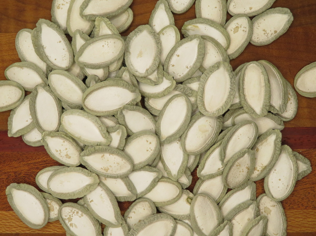 Courge très ornementale à rayures vertes et blanches. Forme ronde, 15 à 22 cm de diamètre. Cultivée pour ses grosses graines aux bords gris argenté très utilisées en cuisine latino-américaine et appréciées du bétail. Chair comestible, mais sans intérêt. Variété rare conservée par Sandhill Preservation Center en Iowa. 90 jours.