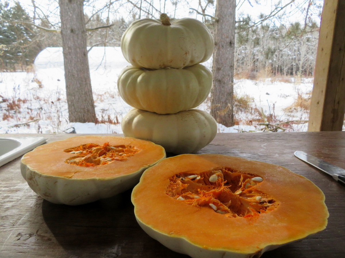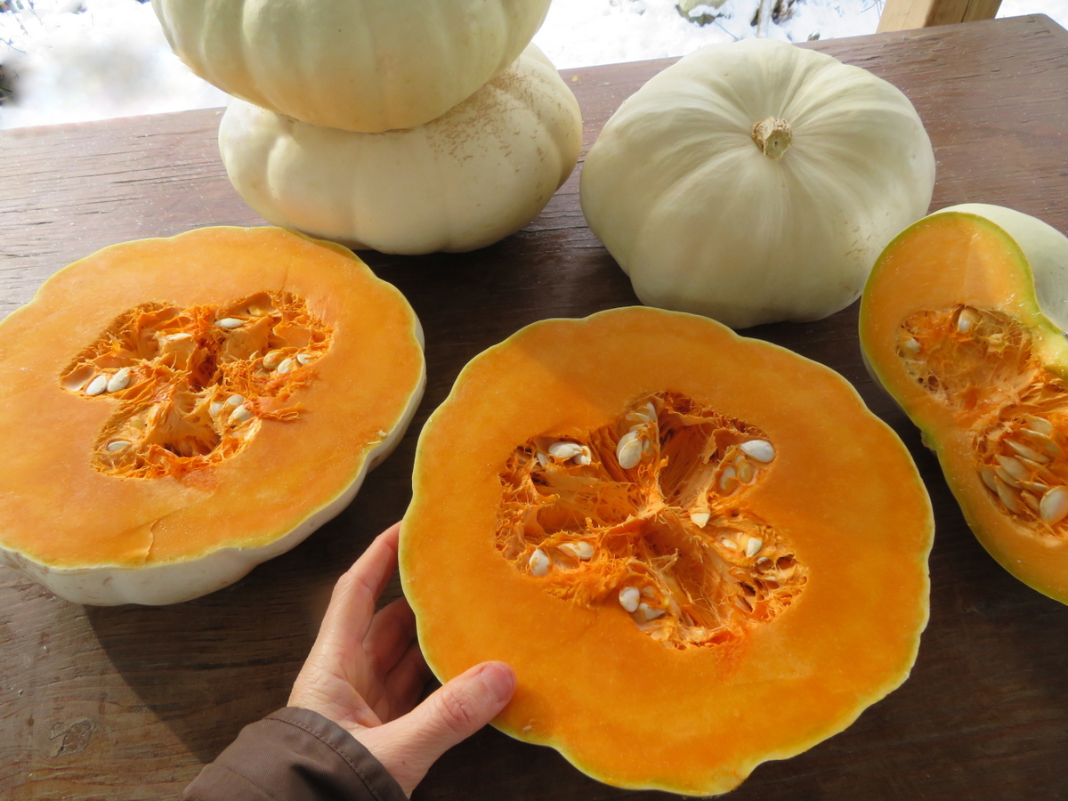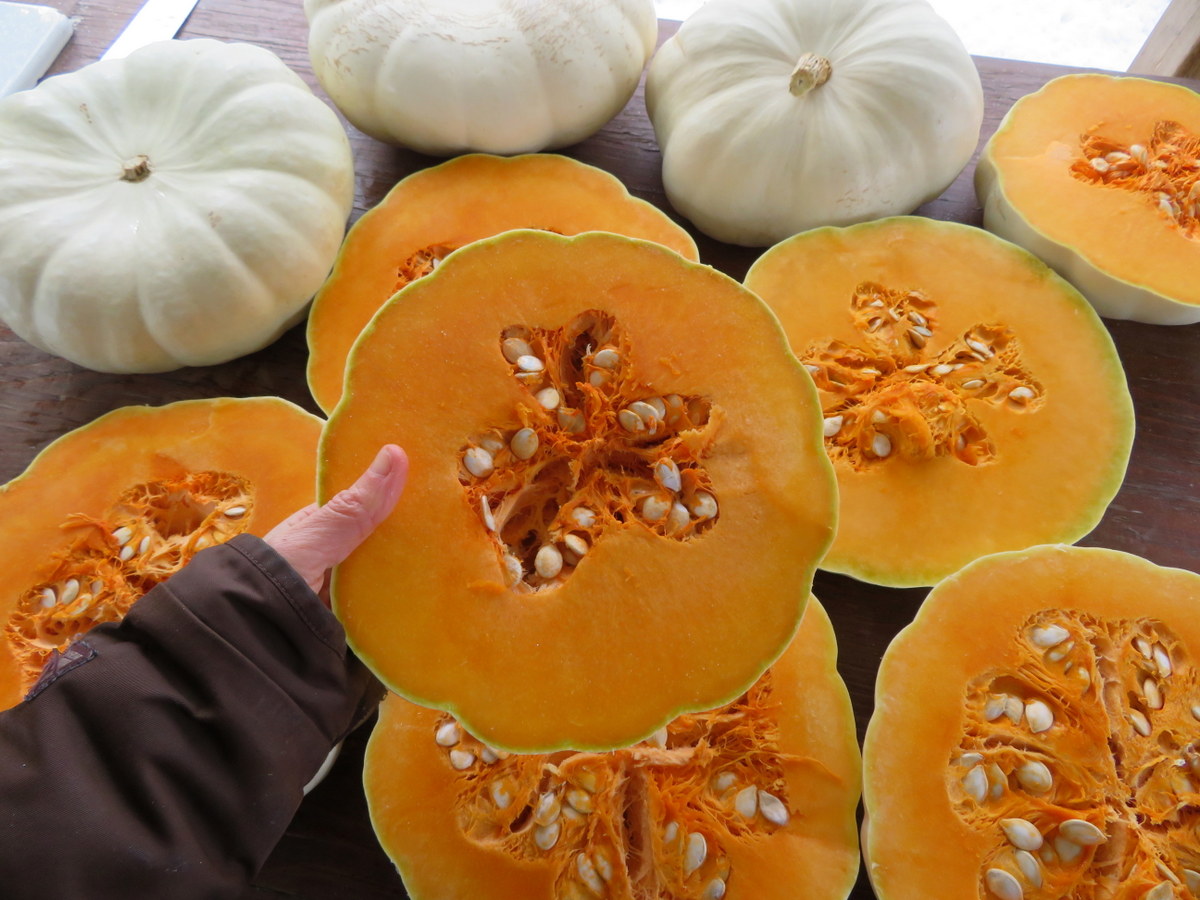 Quand on cherchait une citrouille blanche à mettre au catalogue, on avait toujours le critère de la saveur en tête: c’est bien beau les décorations d’Halloween, mais après il faut qu’elle soit intéressante à manger! De toutes les citrouilles blanches à pollinisation libre qu’on a vu, la courge White Flat Boer Ford est la seule dont la saveur de sa chair mérite une mention dans la description de la variété. Quand on n’en parle pas, d’habitude c’est pas bon signe. 😉