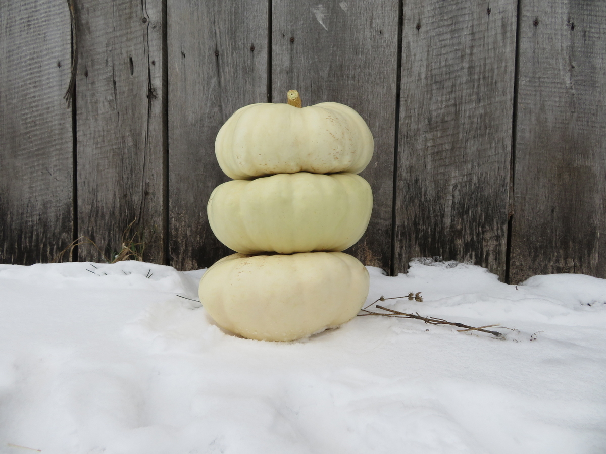 Citrouille blanche de forme aplatie et côtelée. Chair jaune foncé, non fibreuse, saveur douce et peu sucrée. Excellente en potage ou pour n’importe quelle recette sucrée ou salée. 20 à 50 cm de diamètre, 8 à 22 livre. Empilable et décorative. Excellente conservation. Plant de 2 mètres et plus. 2 à 4 courges par plant. Variété ancienne originaire d’Afrique du Sud. 95 jours.