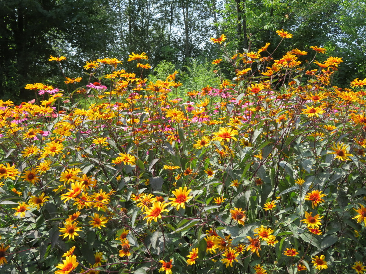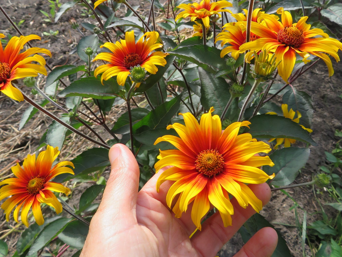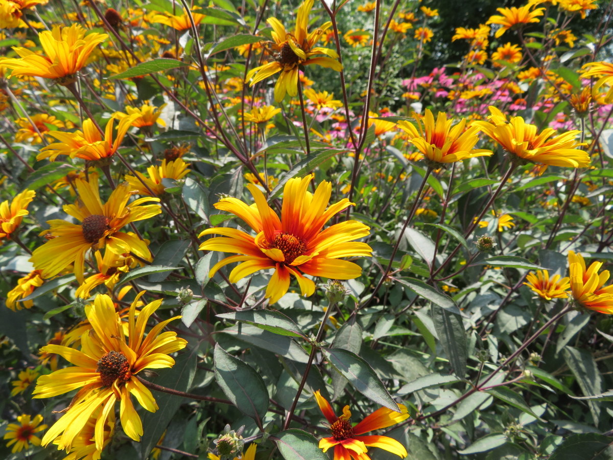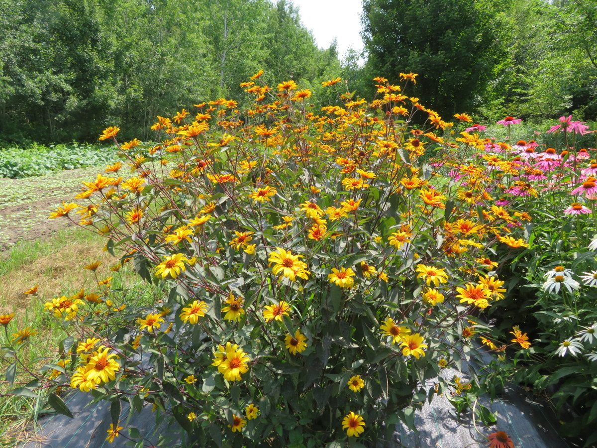 Vivace. Fleur simple ou semi-double, bicolore jaune et orange. Le feuillage est vert foncé et les tiges sont pourpre. 1,20 mètre de hauteur et 60 cm de largeur. N’a pas besoin de support. Longue floraison de juillet à septembre. Attire beaucoup les pollinisateurs et les oiseaux. Excellentes fleurs coupées. Résiste aux cerfs. Zone 3.
