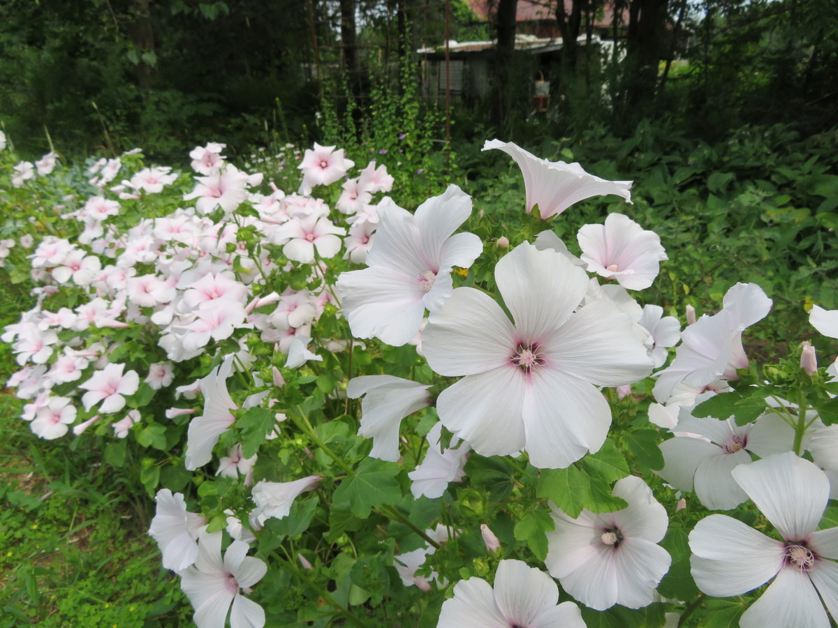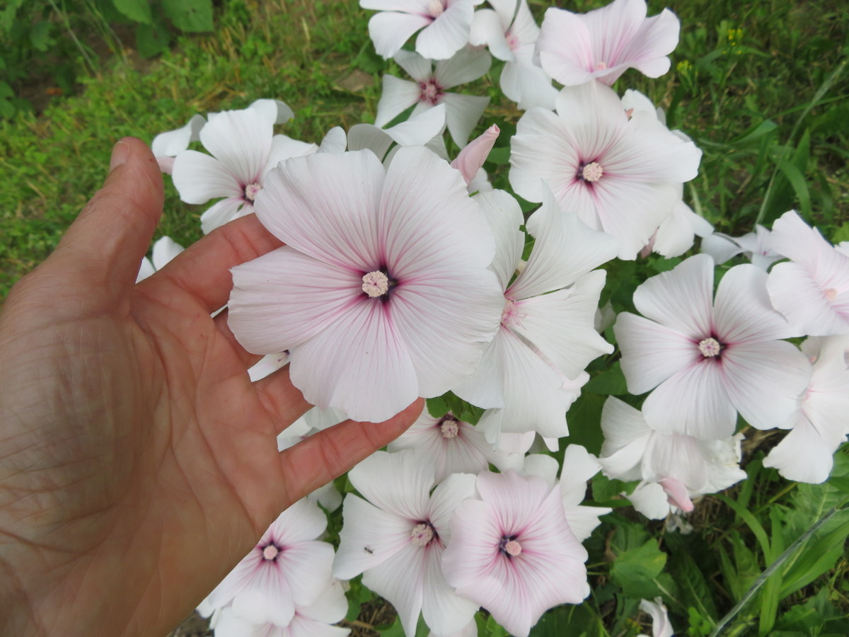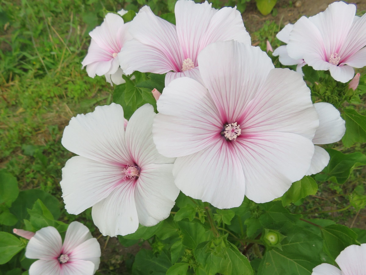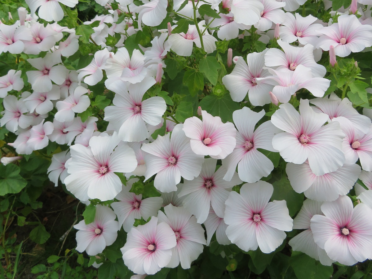 Annuelle. Grandes fleurs de 10 cm de diamètre, blanches au centre veiné de rose. Floraison intense de fin juillet à septembre. Plants arbustifs et compact de 60 à 80 cm de hauteur. Excellentes fleurs coupées. Peut se cultiver en pot.