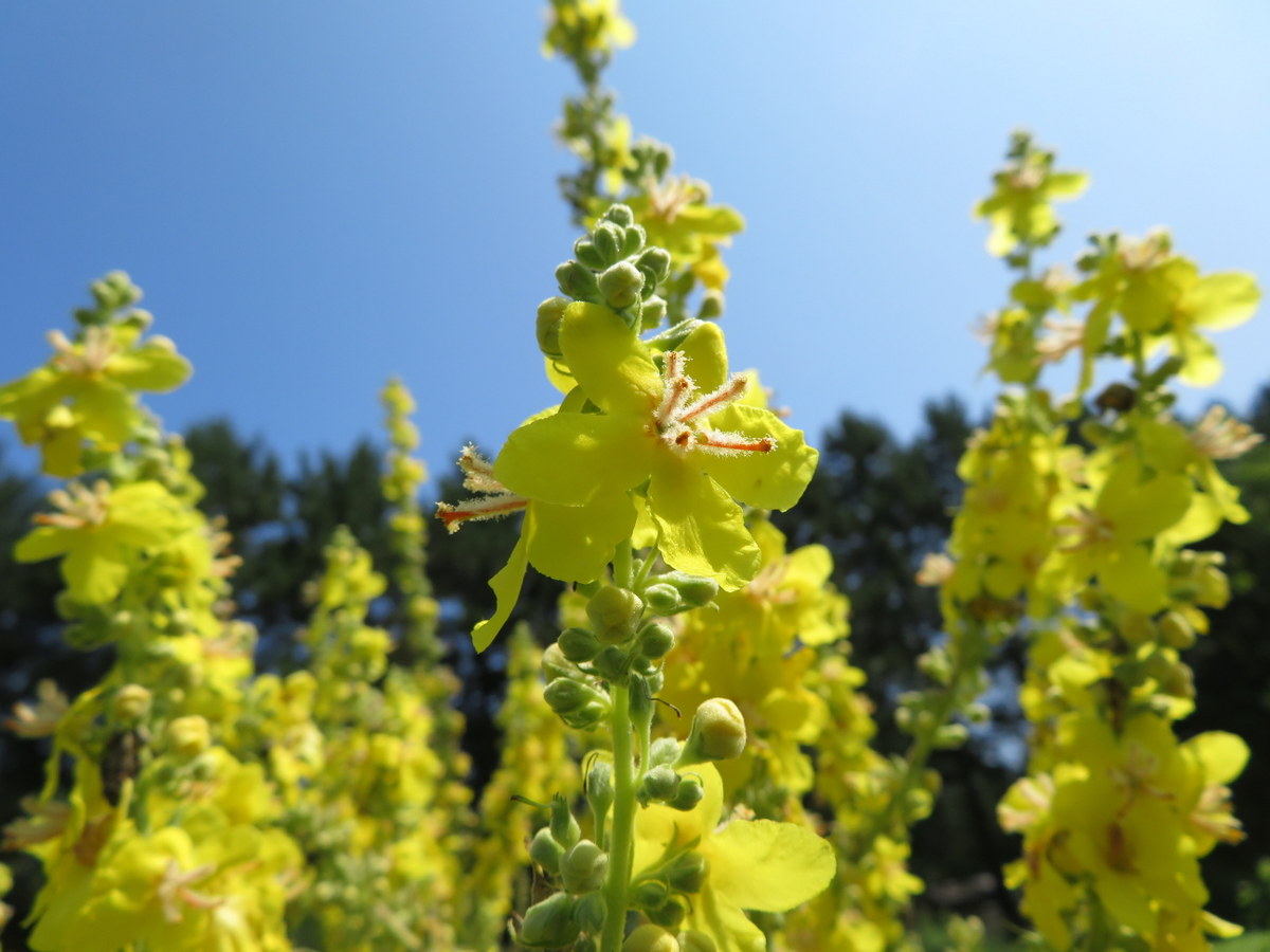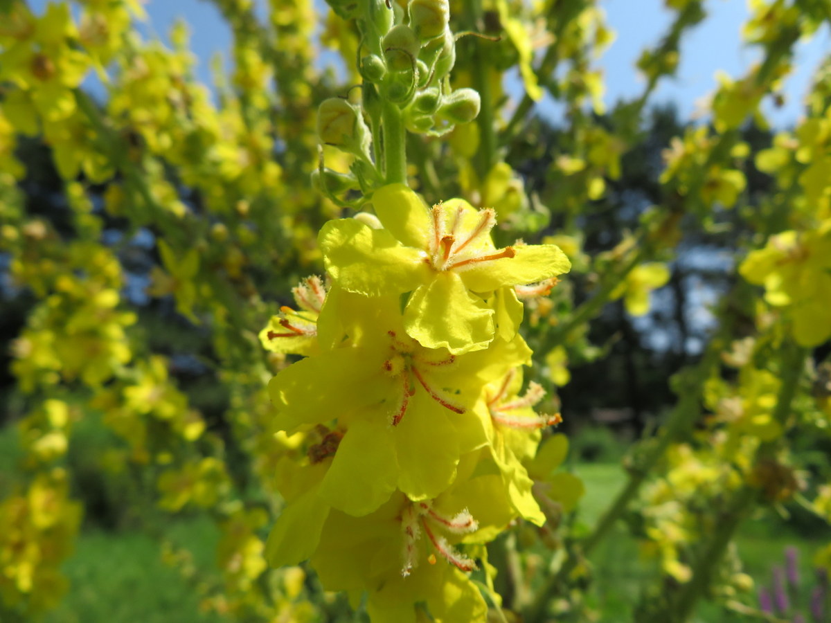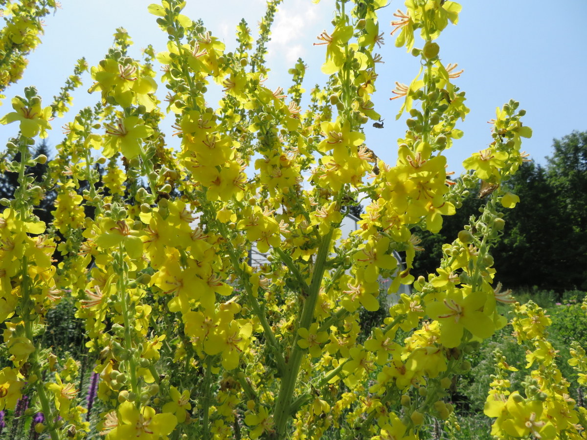 Bisannuelle, parfois trisannuelle. Fleurit la 2e ou 3e année. Rosette de feuillage gris duveteux. Majestueuse hampe florale de petites fleurs jaunes de juillet à septembre. Longue floraison qui attire une très grande variété de pollinisateurs. Jusqu’à 2 mètres de hauteur et plus de 60 cm de largeur. Pour éviter qu’elle se ressème, couper les hampes florales avant qu’elles ne soient en graines. Aussi appelé Molène grecque. Originaire du sud de la Grèce et des montagnes de l’Olympe, en Turquie. Zone 3.